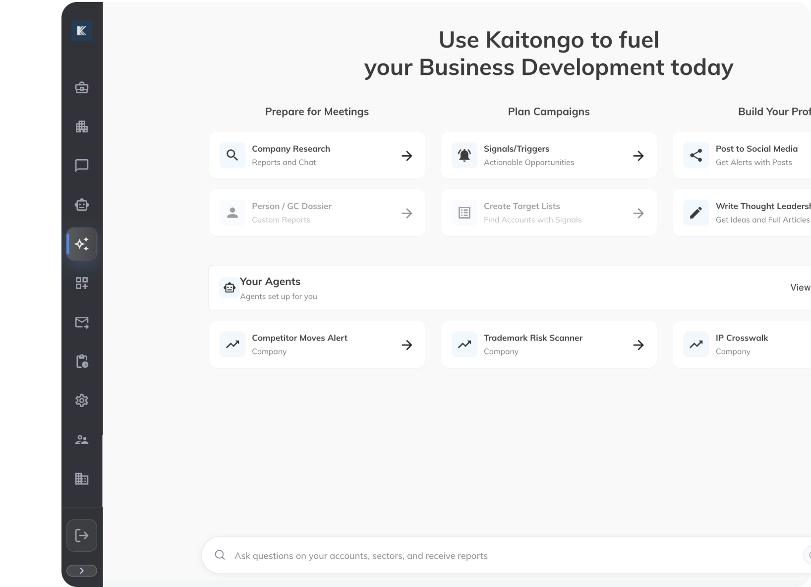 Kaitongo delivers high value signal insights and business research in minutes, enabling BD teams to enhance their value to Attorneys by delivering proactive ideas for key account, sector and practice group meetings.